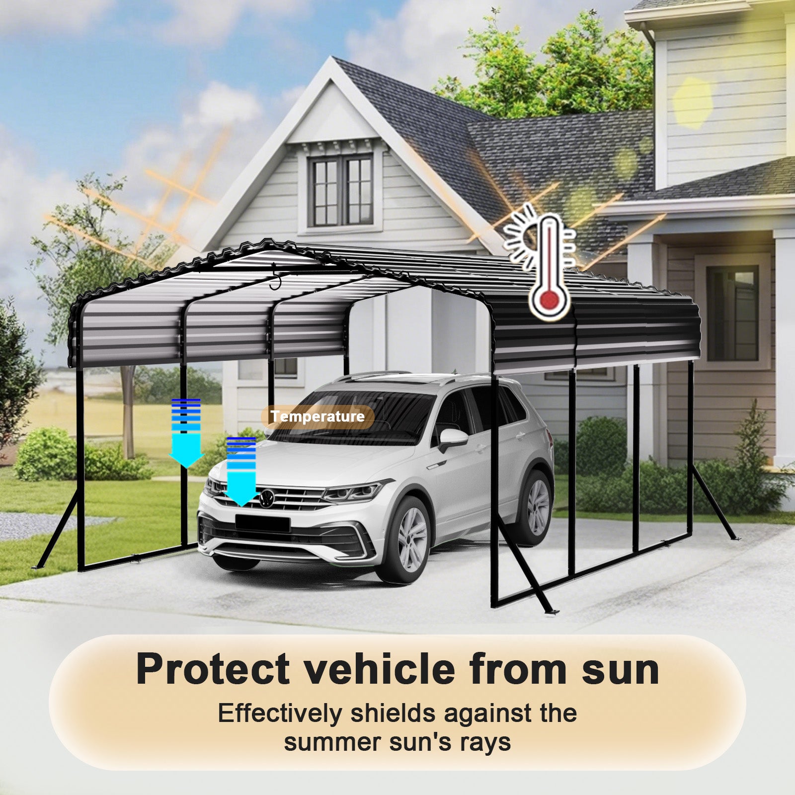 - All-Weather Protection - The Metal Carport uses a galvanized steel roof and powder-coated frame to shield your car from sun, hail, and snow. Plastic spraying enhances corrosion resistance, ensuring long-term durability. This Carport keeps your vehicle cool in summer and prevents snow buildup in winter, making the Heavy Duty Carport Canopy an all-weather solution