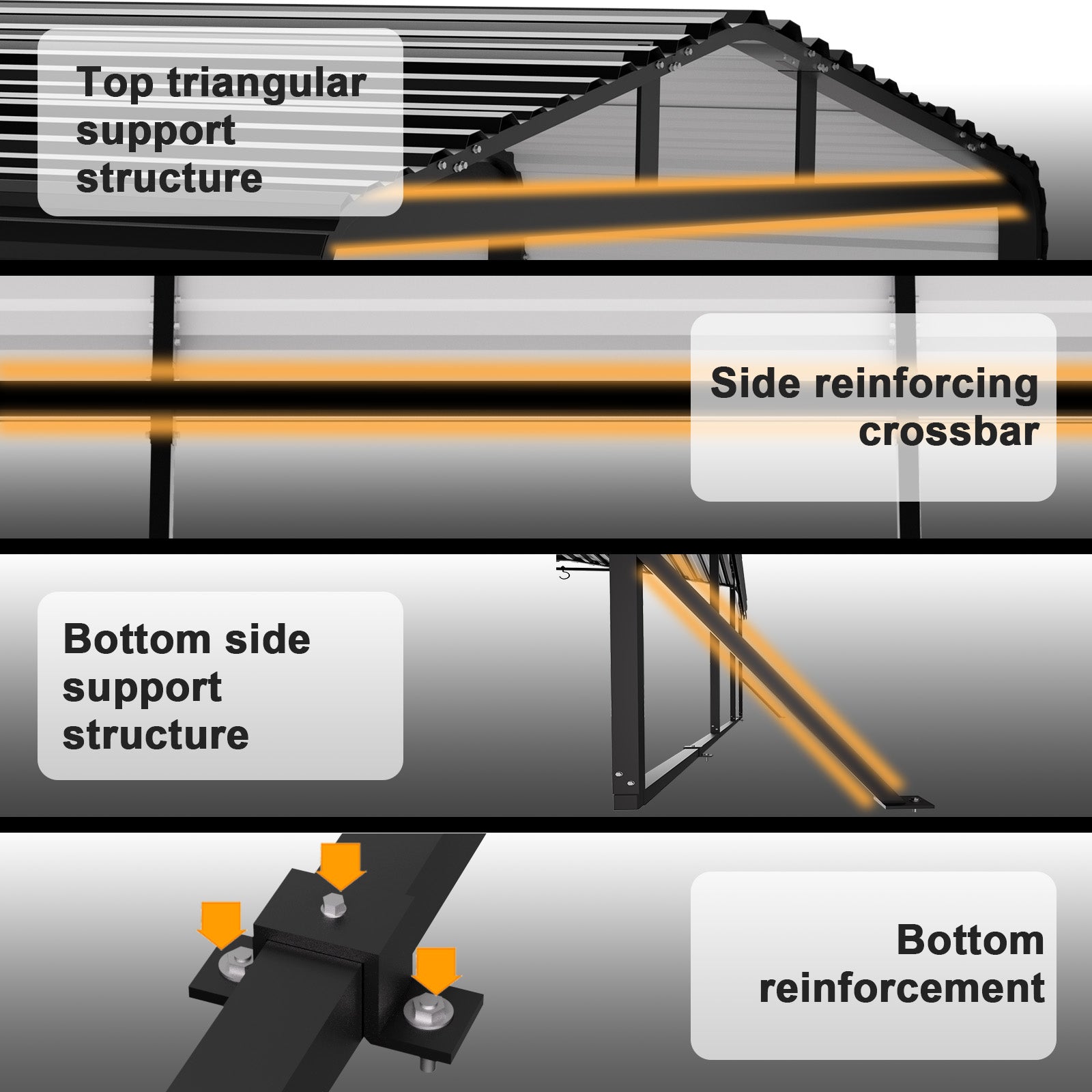- Reinforced Structural Support - This Metal Carport features a reinforced triangular design on the top that greatly enhances load-bearing capacity. The extended edges of the Carport improve rainproof performance, while four side rods and ground reinforcements add stability. As a Heavy Duty Carport Canopy, it protects vehicles, boats, and equipment with durability and strength