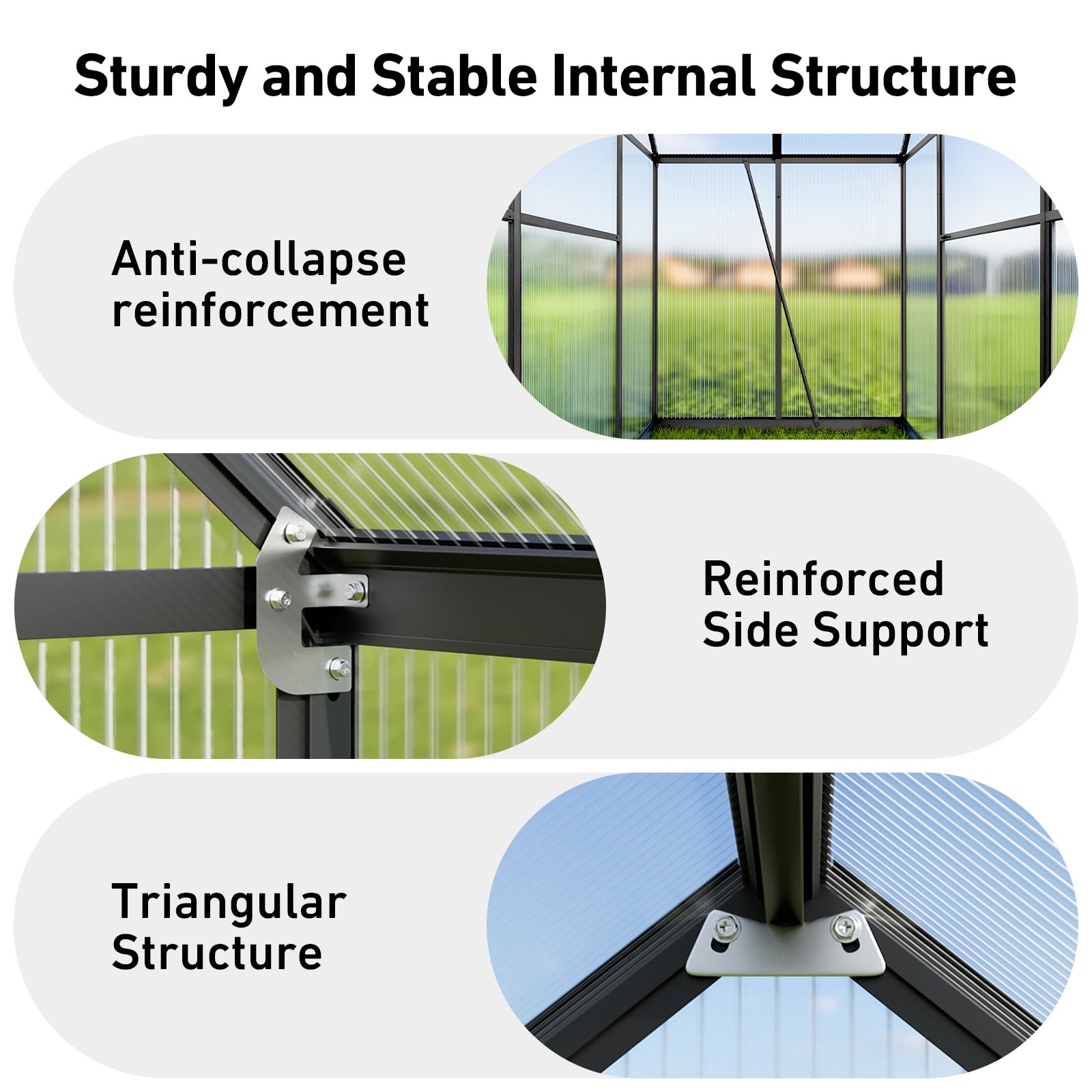 - [Reinforced Triangular Structure & Greater Stability] This outdoor greenhouse is built with a premium aluminum alloy frame, reinforced side supports, and a stable triangular roof design. The heavy-duty walk-in greenhouse delivers 40% greater stability, tested to withstand winds up to 45 mph and snow loads of 20 psf. A durable polycarbonate greenhouse that provides year-round protection for your garden in any season.