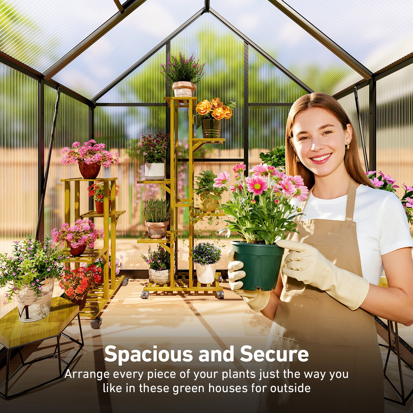 - [Excellent Ventilation & Secure Locking Door] This walk-in greenhouse offers 5-position adjustable ventilation windows to control airflow, temperature, and humidity. The greenhouse door includes a convenient handle lock, ensuring the polycarbonate greenhouse stays safe, secure, and easy to access. Enjoy a well-balanced growing environment for your plants year-round.