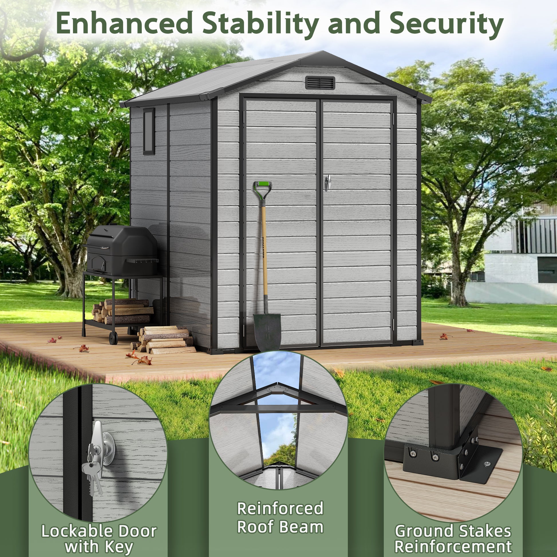 - Ventilated, Quiet, and Moisture-Proof - Thick 14mm resin sheds panels offer excellent sound insulation, reducing outside noise from rain and wind. Built-in vents and translucent windows promote airflow, prevent moisture buildup, and reduce mold risk, keeping your outdoor storage shed and plastic garden shed interior dry, bright, and safe for long-term storage.