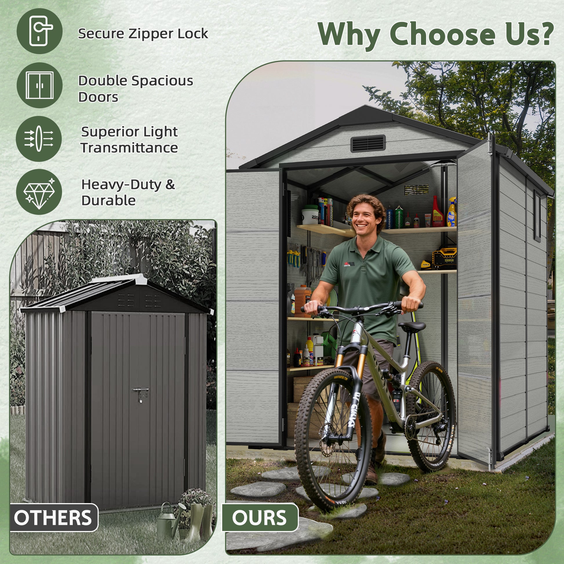 - Spacious Garden Shed with Floor - The roomy 6x6ft interior of this garden resin shed easily stores bikes, lawn mowers, and other outdoor tools. Unlike most metal or partial-floor plastic sheds, this resin storage shed with floor includes a durable polypropylene floor, saving extra cost and allowing immediate use after assembly.