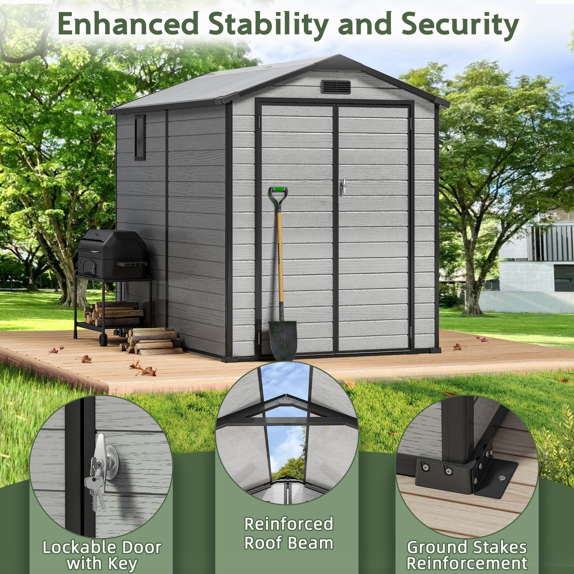 - Ventilated, Quiet, and Moisture-Proof - Thick 14mm resin sheds panels offer excellent sound insulation, reducing outside noise from rain and wind. Built-in vents and translucent windows promote airflow, prevent moisture buildup, and reduce mold risk, keeping your outdoor storage shed and plastic garden shed interior dry, bright, and safe for long-term storage.