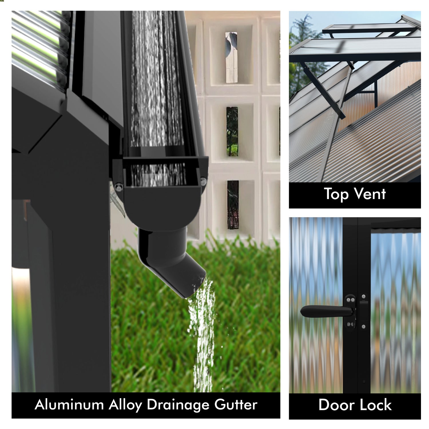 - OPTIMAL AIRFLOW AND DRAIN DESIGN – With adjustable ventilation windows and a lockable door, this heavy duty greenhouse kit can ensure both fresh air circulation and safety for your plants. The built-in gutter system of the greenhouse roof allows for efficient rainwater drainage. So you can easily collect water for your plants. This design keeps your greenhouse cool and comfortable while providing a secure environment for your plants to thrive