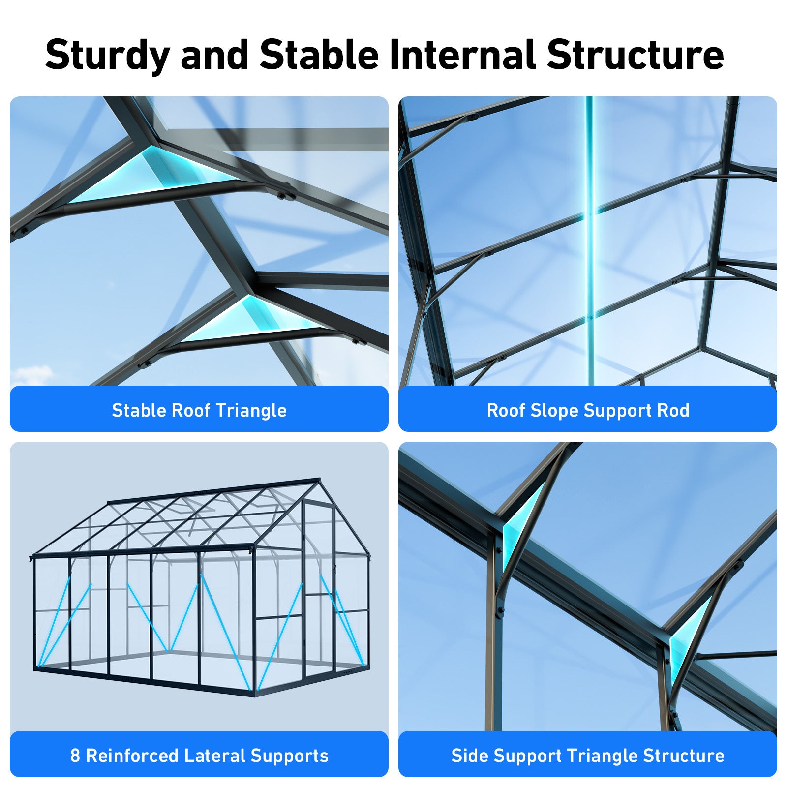 - Heavy-Duty Aluminum Frame – Built with a reinforced aluminum alloy frame and polycarbonate panels, this garden greenhouse delivers strength and stability against wind, rain, and snow. Perfect as a reliable backyard greenhouse for year-round gardening.