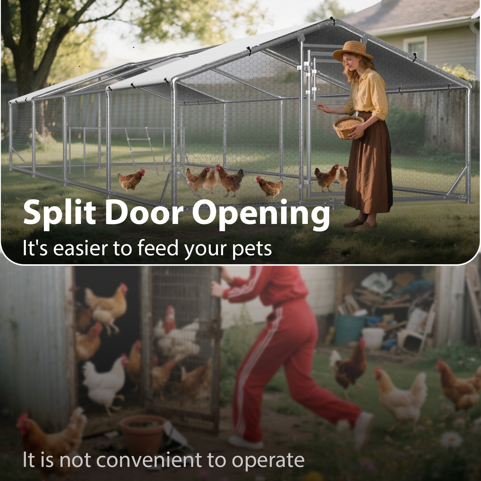 - All-Weather Chicken Coop Protection: This robust metal chicken pen features an innovative dual-panel roof system— one extra protective layer than standard coops. Each panel combines awater-resistant polymer coating, high-strength 420D Oxford fabric and reflective silver coating, engineered to endure heavy rain, UV rays, and extreme temperatures. Reinforced by rust-proof steel frames and hexagonal wire mesh, the chicken coop ensures maximum ventilation while preventing escapes and deterring predators. Your poultry enjoys a predator-safe, climate-controlled habitat year-round, backed by unmatched durability.