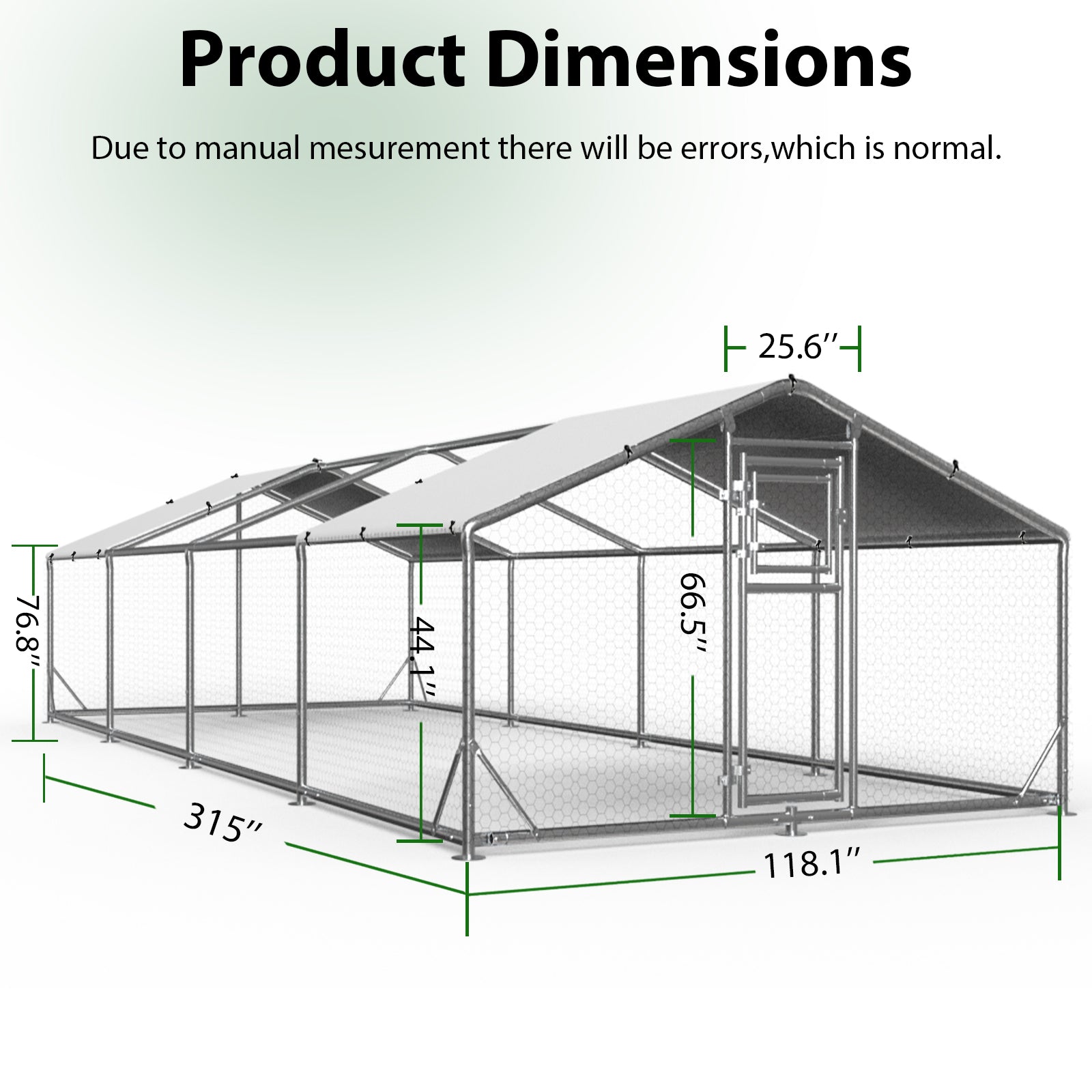 Metal Chicken Coop with Waterproof Cover, Large Walk-in Poultry Run for Backyard, Reinforced Frame with Perch Ladder for Chickens, Ducks & Small Pets, 9.8x26.2x6.4FT