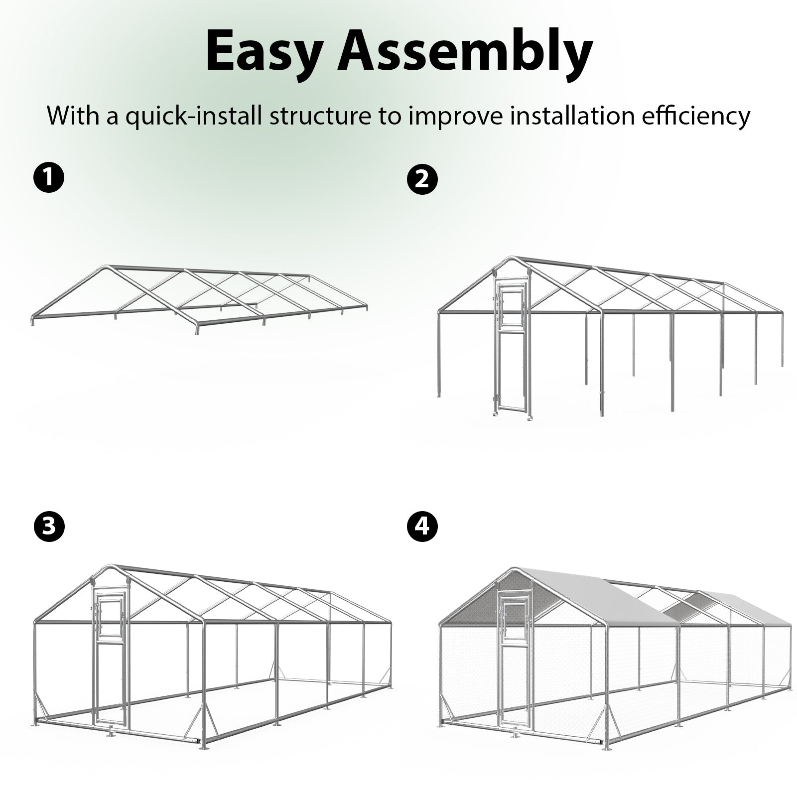 - Quick-Assembly Metal Gallinero: This walk in chicken coop assembles within 3 hours with a partner – no construction experience needed! Pre-drilled parts snap together effortlessly using visual instructions. Simply unfold, connect, and secure your metal chicken coop for instant backyard readiness.