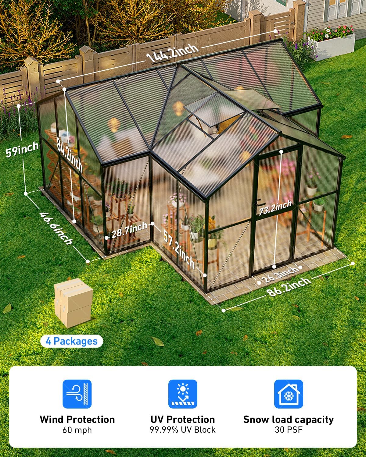 - [Quick & Easy Assembly] All parts are clearly labeled, with detailed instructions and necessary tools included. Numerous quick-install connectors reduce setup time by up to 40%, letting you enjoy your T-Shape greenhouse faster. This aluminum greenhouse sunroom ships in multiple packages, which may arrive separately. For any questions about assembly or delivery, our team is ready to help.